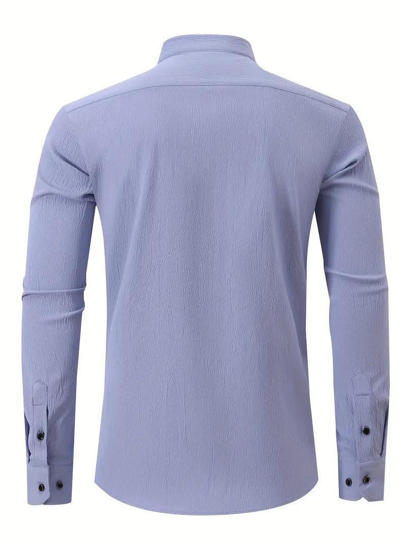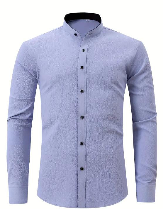 Męska koszula formalna z długim rękawem przeznaczona do sytuacji wymagających uporządkowanego i rzeczowego charakteru. Zapięcie na guziki oraz stójkowy kołnierz tworzą spójną, prostą formę. Delikatny wzór powierzchni nadaje całości wyrazistości, zachowując powściągliwy ton odpowiedni do pracy i spotkań służbowych.