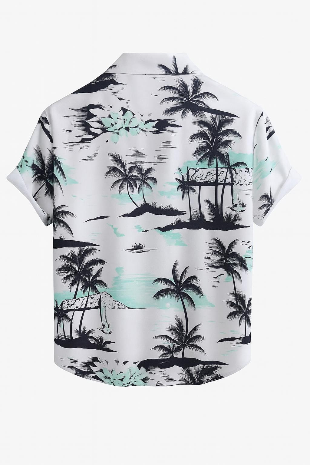 Męska koszula z krótkim rękawem z motywem tropikalnym, przeznaczona do noszenia w cieplejsze dni. Otwarty kołnierz oraz podwinięte rękawy nadają całości swobodniejszy, lecz uporządkowany charakter. Ilustrowany wzór wprowadza wyrazistość, sprawdzając się podczas codziennych zajęć, wyjazdów oraz spotkań towarzyskich.